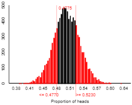 We could stop there, absolutely. We don’t need to calculate a p-value or anything else in order to draw this conclusion. We can see all we need from the graph of simulation results. But let’s go ahead and calculate the (approximate) p-value from the simulation. Because we have a two-sided alternative, a sample proportion will be considered as “extreme” as the observed one if it’s at least as far from 0.5 as 0.523 is. In other words, the p-value is the probability of obtaining a sample proportion of 0.477 or less, or 0.523 or more, if the null hypothesis were true. The applet reveals that 4775 of the 10,000 simulated sample proportions are that extreme, as shown in red below: