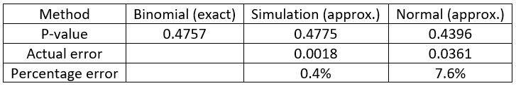 But look at the two p-values we have generated: 0.4775 and 0.4396. Sure, they’re in the same ballpark, but they’re noticeably different. On a percentage basis, they differ by 8-9%, which is non-trivial. Which p-value is correct? This one is easy: Neither is correct! These are both approximations.