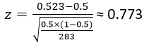 When I first asked about how to investigate the research question, you might have been thinking that we could use a normal approximation, also known as a one-proportion z-test. Let’s do that now: Apply a one-proportion z-test to these data, after checking the sample size condition. The condition is certainly satisfied: 283(.5) = 141.5 is far larger than 10. The z-test statistic can be calculated as: