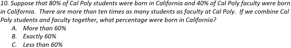 When I ask for this calculation, I’ve been surprised by students giving an answer less than 70%. I understand that mistakes happen, of course, or that a student would not know how to solve this, but I can’t understand why they wouldn’t realize immediately that the answer has to be larger than 70%. I decided to ask this multiple-choice version of the question, which does not require a numerical answer or any calculation. I’m still surprised that a few students get this wrong.