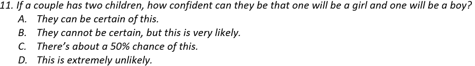The goal here is to assess whether students realize that a probability such as 0.5 refers to a long-run proportion and does not necessarily hold in the short-run. A sample size of two children definitely falls into the short-run and not long-run category, so it’s not guaranteed or even very likely to have one child of each sex.