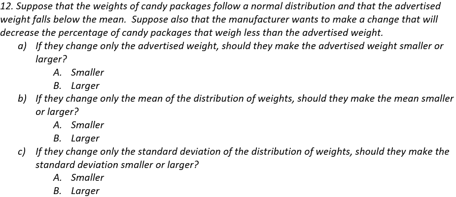 To answer part (b), students should realize that decreasing the percentage of underweight packages would require putting more candy in each package, so the mean of the distribution of weights would need to increase.