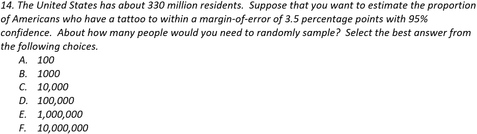 P.P.S. I thank Beth Chance for introducing me question #14 above (about the sample size needed to obtain a reasonable margin-of-error for the population of all U.S. residents). Beth tells me that she borrowed this question from Tom Moore, so I thank him also.
