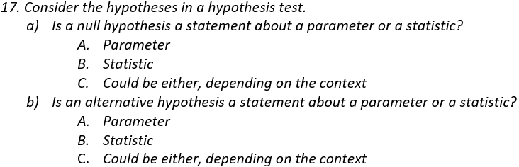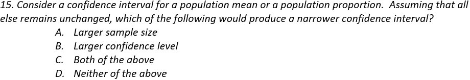 My mantra of “ask good questions” applies to exams as well as in-class learning activities. This week I present and discuss twenty multiple-choice questions that I have used on final exams. All of these questions are conceptual in nature. They require no calculations, they do not refer to actual studies, and they do not make use of real data. I certainly do not intend these questions to comprise a complete exam; I strongly recommend asking many free-response questions based on real data and genuine studies as well.