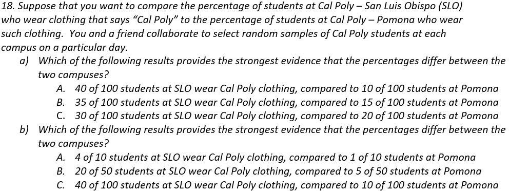 It does help to have been in a statistics classroom for part (b), although many students have correct intuition that larger sample sizes produce stronger evidence of a difference between the groups, when the difference in success proportions is the same.