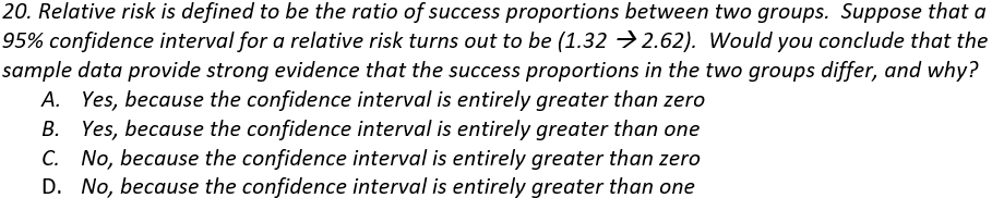 This is another example of asking students to think through a statistic that they may not have encountered in class. They should recognize that a relative risk greater than one indicates that one group has a higher success proportion than the other. In this case, a confidence interval consisting entirely of values greater than one provides strong evidence that the success proportions differ between the two groups.