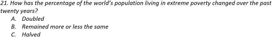 P.S. More information for Rosling’s claim and survey data about the global extreme poverty rate (question #21) can be found here and here and here.