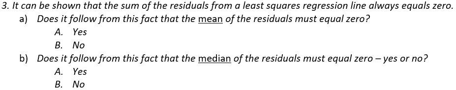 This question should be very easy for all students, but some struggle. The question boils down to: If the sum of values equals zero, does the mean have to equal zero, and does the median have to equal zero? The answer is yes to the first, because the mean is calculated as the sum divided by the number of values. But the answer is no to the second, as seen in this counterexample where the mean is 0 but the median is not: -20, 5, 15. The fact that this question is stated about residuals is completely irrelevant to answering the question, but the mention of residuals leads some students to think in unhelpful directions.