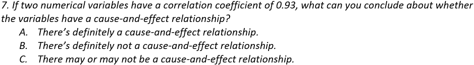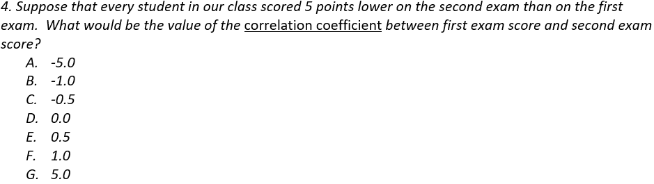 This question has been extremely challenging for my students. I used to ask it without providing options, and the most common response was “the same.” That’s right: Many students did not realize that they should provide a number when asked for the value of a correlation coefficient. Among these options, it’s very discouraging when a student selects -5, apparently not knowing that a correlation coefficient needs to be between -1 and +1 (inclusive), but this answer is tempting to some students because of the “5 points lower” wording in the question. Another commonly selected wrong answer is -1. I think students who answer -1 realize that the data would fall on a perfectly straight line, so the correlation coefficient must be -1 or +1, but the “lower” language fools them into thinking that the association is negative.