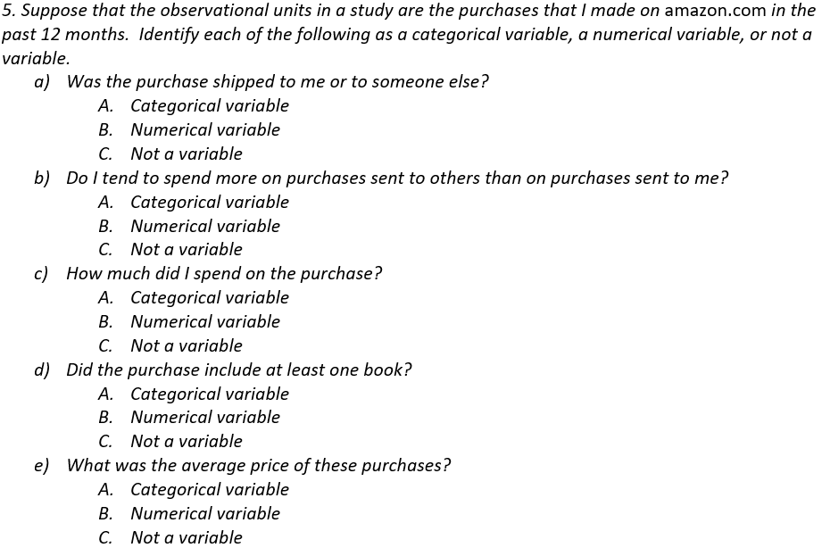Most students correctly identify (a) and (d) as categorical variables and (c) as a numerical variable. The most challenging parts are (b) and (e), which are not variables for these observational units. I try to emphasize that variables are things that can be recorded for each observational unit, not an overall question or measure that pertains to the entire dataset.