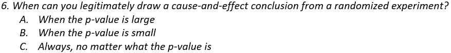 I started asking this question after I noticed that some of my students believe that conducting a randomized experiment always justifies drawing a cause-and-effect conclusion, regardless of how the data turn out! The good news is that very few students give answer A. The bad news is that more than a few give answer C.