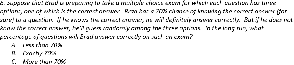 I often ask this question as a calculation to be performed in my courses for mathematically inclined students. To calculate the correct percentage, note that Brad will get 70% right because he knows the answer, and he’ll guess correctly on 1/3 of the other 30%. So, his long-run percentage correct will be 70% + 1/3(30%) = 80%.