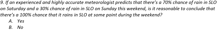 This is essentially the same question as I asked in post #16 (here) about whether the percentage of American households with a pet dog plus the percentage with a pet cat equals the percentage with either a pet dog or a pet cat. Adding these percentages is not legitimate because the events are not mutually exclusive: It’s possible that it could rain on both Saturday and Sunday. I hope that choosing 70% and 30% as the percentages is helpful to students, who might be tipped off by the 100% value that something must be wrong because rain cannot be certain.
