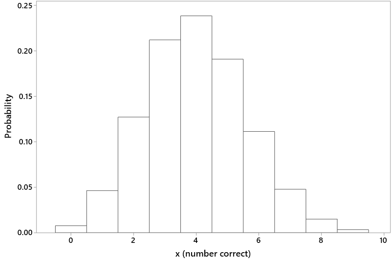 Under the assumption of random selection among the three options on all twelve questions, the probability distribution of X, the number of correct answers, would follow a binomial distribution with parameters n = 12 and p = 1/3. A graph of this probability distribution is shown here: