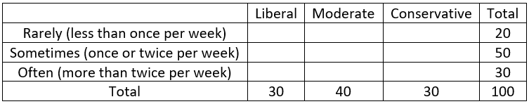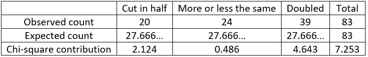 The p-value, from a chi-square distribution with 2 degrees of freedom, is ≈ 0.027. This p-value is fairly small (less than .05) but not very small (larger than .01), so we can conclude that the sample data provide fairly strong evidence against the hypothesis that students in the population would be equally likely to select among the three options. The sample data suggest that students are more likely to give the most pessimistic answer (doubled) and less likely to give the most optimistic, correct answer (cut in half). This conclusion should be regarded with caution, though, because the sample (students in my class) was not randomly selected from the population of all students at our school.