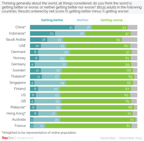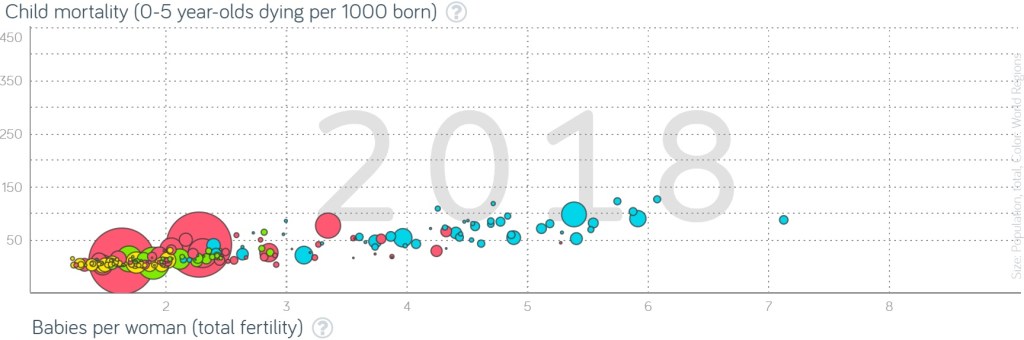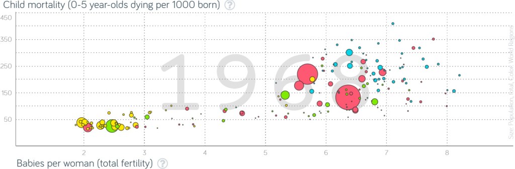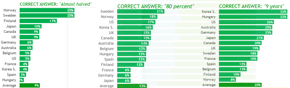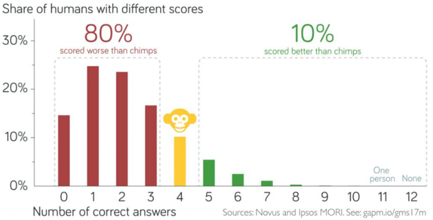 The next three questions concern Hans Rosling’s Gapminder/Ignorance Test. I presented three of the twelve questions on this test in the previous post (here). Each of the twelve questions asks respondents to select one of three options. The correct answer for each question is the most optimistic of the three options presented.