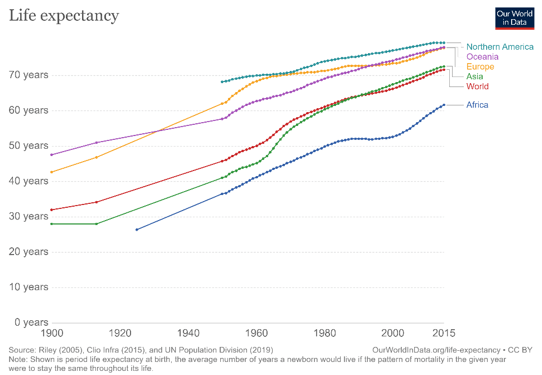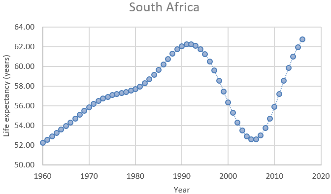 1. The following graph displays how life expectancy has changed in South Africa over the past few decades: