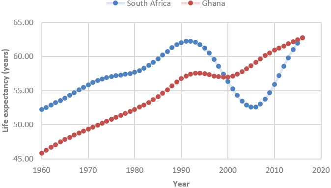 - Ghana had a much lower life expectancy than South Africa in 1960 and had a very similar life expectancy in 2016.