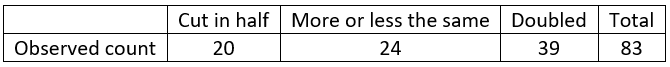 I asked my students the question about how the extreme poverty rate has changed, before revealing the answer. The table below shows the observed counts for the three response options in a recent class: