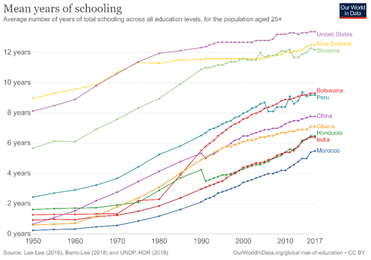 The six questions that I have presented here only hint at the possibilities of asking questions that help students to learn important statistical content while also exposing them to data that reveal human progress. I also encourage teachers to point their students toward resources that empower them to ask their own questions, and analyze data of their own choosing, about the state of the world. I listed several websites with such data at the very end of the previous post (here).