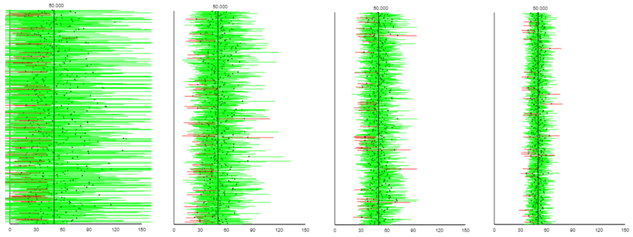 Many students look at me blankly when I first ask for their guesses. I explain that the first entry means that only two people apply for the job. Make a guess for the probability that you successfully select the best candidate, according to the rules described above. Then make a guess for this probability when four people apply. Then increase the applicant pool to 12 people, and then 24 people. Think about whether you expect this probability to increase, decrease, or stay the same as the number of candidates increases. Then what if 50, or 500, or 5000 people apply – how likely are you to select the very best applicant, subject to the harsh rules we’ve discussed? Finally, the last entry is an estimate of the total number of people in the world (obtained here on May 24, 2020). What’s your guess for the probability of selecting the very best candidate if every single person on the planet applies for the job?