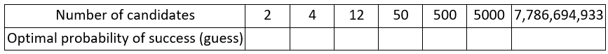To prompt students to think about how daunting this task is, I start by asking: For each of the numbers of candidates given in the table, make a guess for the optimal probability that you will succeed at hiring the best candidate.