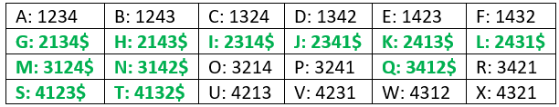 When most of the student groups have finished, I go through the orderings one at a time and ask them to tell me whether or not it results in success for the “let 1 go by” strategy. As we’ve already discussed, the first row, in which the best candidate arrives first, does not produce any successes. But the second row tells a very different story. All six orderings in the second row produce success for the “let 1 go by” strategy. Because the second-best candidate arrives first in the second row, this strategy guarantees that you’ll keep looking until you find the very best candidate. The third row is a mixed bag. Orderings M and N are winners because the best candidate is second in line. Orderings O and P are instructive, because we are fooled into hiring the second-best candidate and leave the best waiting in the wings. Ordering Q produces success but R does not. In the fourth row, the first two orderings are winners but the rest are not. Here’s the table, with successes marked by $ in bold green: