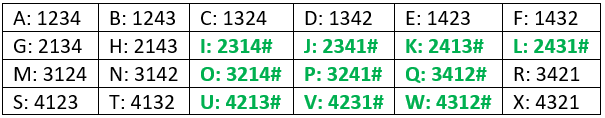 How about the “let 2 go by” strategy? Again the first row produces no successes. The first two columns are also unlucky, because the best candidate was second in line and therefore passed over. Among the orderings that are left, all produce successes except R and X, where we are fooled into hiring the second-best candidate. Orderings O, P, U, V, and W are worth noting, because they lead to success for the “let 2 go by” strategy but not for “let 1 go by.” Here’s the table for the “let 2 go by” strategy, with successes marked by # in bold green: