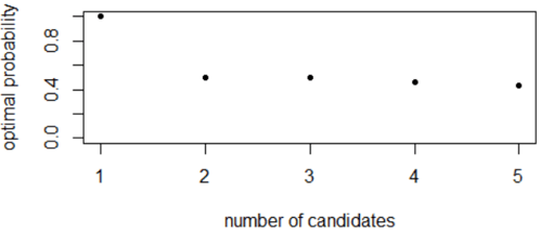 How does this probability compare to the optimal strategy with 3 candidates? The probability has decreased a bit, from 0.5 to 0.4583. This is not surprising; we knew that the task gets more challenging as the number of candidates increases. What is surprising is that the decrease in this probability has been so small as we moved from 2 to 3 to 4 candidates. How does this probability compare to the naïve strategy of hiring the first person in line with 4 candidates? We’re doing a lot better than that, because 45.83% is a much higher success rate than 25%.