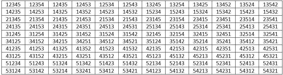 Ready for one more? Now suppose that there are 5 candidates. What’s your guess for the optimal strategy – let 1 go by, or let 2 go by, or let 3 go by? In other words, the question is whether we want to garner information from just one candidate before we seriously consider hiring, or if it’s better to learn from two candidates before we get serious, or perhaps it’s best to take a look at three candidates. I don’t care what students guess, but I do want them to reflect on the Key Insight underlying this question before they proceed. How many possible orderings are there? There are now 5! =120 possible orderings. Do you want to spend your time analyzing these 120 orderings by brute force, as we did with 24 orderings in the case of 4 candidates? I am not disappointed when students answer no, because I hope this daunting task motivates them to want to analyze the general case mathematically. Just for fun, let me show the 120 orderings: