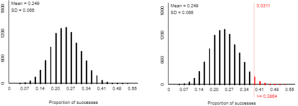 - e) Run the simulation analysis, and describe the resulting null distribution of the sample proportion.