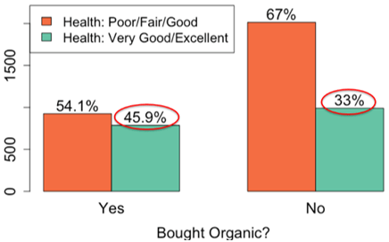 Because the NHANES respondents were not randomly assigned to buy organic food or not, it’s not surprising that we do observe substantial differences between the groups, and we would suspect differences even if we could not observe them directly. This doesn’t mean that buying organic food doesn’t improve health status*, but this does mean that we cannot jump to the causal conclusion from these data alone. We have no way of knowing whether the observed differences in reported health were due to a causal effect of buying organic food or due to the fact that the organic buyers differed from non-organic buyers to begin with.