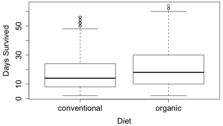 Organic-fed flies lived an average of 20.31 days, as compared to an average of 17.06 days for conventional-fed flies, giving a difference in means of 3.25 days (which is long in the lifespan of a fruit fly!).