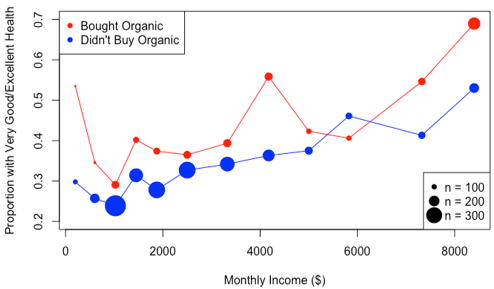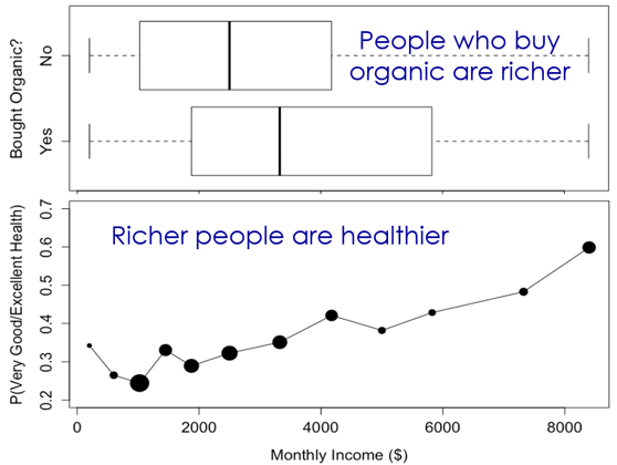 The sample data reveal that people who buy organic are richer, and richer people are healthier, so we would expect organic buyers to be healthier, even if buying organic food provided no real health benefit. This is a concrete example of confounding, one that students can grasp. Of course, income is not the only difference between people who buy organic and those who don’t, as students are quick to point out. Given all of the differences, it is impossible to determine whether the better health statuses among organic buyers are actually due to buying organic food, or simply to other ways in which the groups differ.