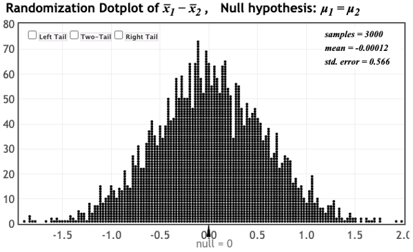We notice that the observed difference in sample means of 3.25 days is nowhere to be seen on this distribution, and hence very unlikely to occur just by random chance. (The sample statistic is even farther out in the tail for the NHANES dataset.) We have convincing evidence against just random chance!