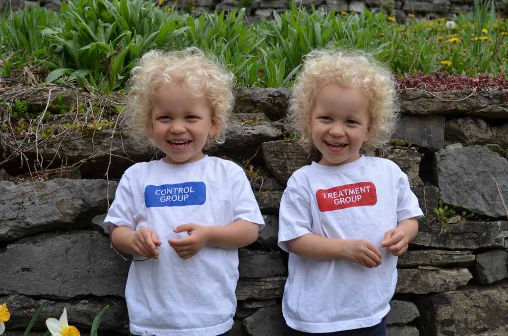While random assignment creates groups that are similar on average, in any particular randomization groups may differ just due to random variation. In fact, my Ph.D. dissertation was on rerandomization – the idea that you can, and should, rerandomize (if you do it in a principled way) if randomization alone does not yield adequate balance between the groups. In an introductory course, we can touch on some classical experimental designs aimed to help create groups even more similar than pure randomization, for example, by randomizing within similar blocks or pairs. One classic example is identical twin studies, which I can’t resist closing with because I can show a picture of my identical twin sons Cal and Axel in their treatment and control shirts!