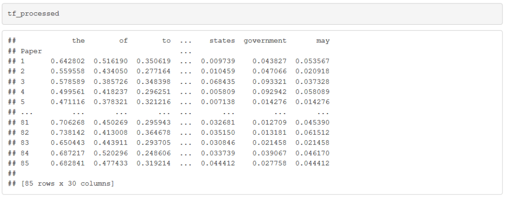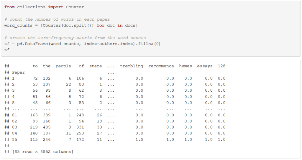 After writing some boilerplate code to read in and clean up the texts of the 85 papers, we split each document into a list of words and count up the number of times each word appears in each document. My students would implement this in the programming language Python, which is a general-purpose language that is particularly convenient for text processing, but the task could be carried out in any language, including R.