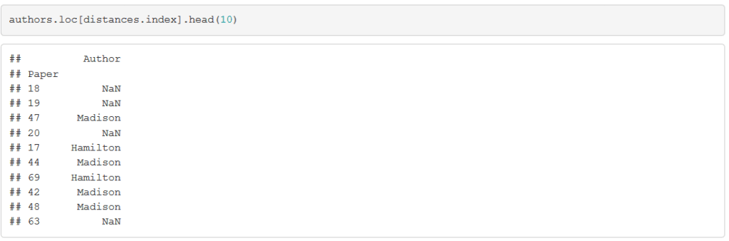 Although the second closest paper, Paper #19, is also disputed (which is why its author is given as the missing value NaN), the third closest paper was definitively written by Madison. If we look at the 3 closest papers with known authorship, 2 were written by Madison. This suggests attributing Paper #18 to Madison.