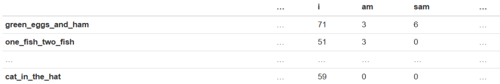 One simple approach is a bag of words. In the bag of words representation, each row is a book (or, more generally, a “document”), and each column is a word (or, more generally, a “term”). Each entry in the table is a frequency representing the number of times a term appears in a document. This table, called the “term-frequency matrix,” is illustrated below: