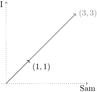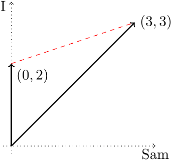 and the words of interest are “Sam” and “I.” Then the two vectors are x1 = (3,3) and x2 = (0,2), because the first document contains 3 of each word, and the second includes no “Sam”s and two “I”s. These two vectors, and the distance between them, are shown here: