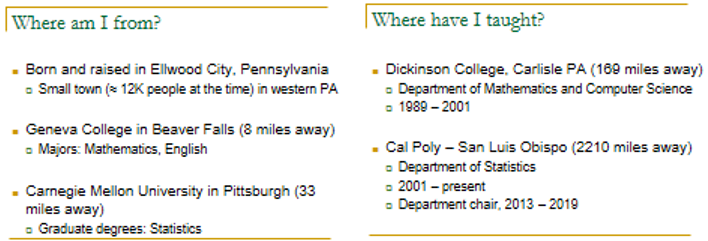 After those four variables and graphs were matched up, students got much quieter when I asked for another volunteer. I wish that I had set up a Zoom poll in advance to ask them to express their guesses for the rest, but I did not think of that before class. Instead I asked for a description of graph #3. A student said that there are a lot of identical values on the low end, and then a lot of different values through the high end. When I asked about which variable that pattern of variation might make sense for, a student suggested snowfall amounts. What’s your reasoning for that? The student wisely pointed out that I had said that the cities were taken from around the U.S., so that should include cities such as Los Angeles and Miami that see no snow whatsoever.