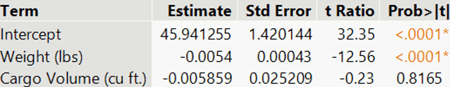 This question tries to assess a big-picture idea with multiple regression. The result of a t-test for an individual predictor variable only pertains to the set of predictor variables used in that model. This output reveals that cargo volume is not a helpful predictor of MPG rating when used in conjunction with weight. But cargo volume may or may not be a useful predictor of MPG rating on its own.