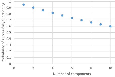 If we let Si represent the event that component i functions successfully, the probability in part (a) is: Pr(S1 and S2) = Pr(S1) × Pr(S2) = (0.95)^2 = 0.9025, using the multiplication rule for independent events. Similarly, Pr(S1 and S2 and S3) = (0.95)^3 ≈ 0.857, which is a smaller probability. The general expression is: Pr(S1 and S2 and … and Sn) = (0.95)^n. This function decreases gradually, as shown in the graph below. This decrease makes sense because, as a single bad component is all that’s needed to cause the system to fail, each additional component provides another opportunity for such failure.