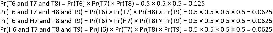 c) Determine the probability that the Domestic Shorthairs win two games before the Cache Cows win two games. This question is somewhat similar to “unfinished game” example from post #99, here. This probability can be calculated as: Pr[(W1 and W2) or (W1 and L2 and W3) or (L1 and W2 and W3)] = 0.6×0.6 + 0.6×0.4×0.6 + 0.4×0.6×0.6 = 0.648. When I present this as an in-class example rather than an out-of-class assessment, I first ask students to predict, without performing calculations, whether the answer will be equal to 0.6, less than 0.6, or greater than 0.6.