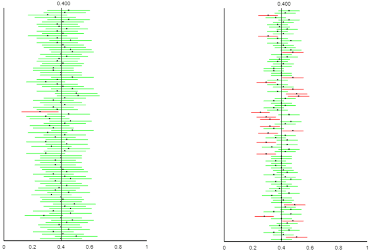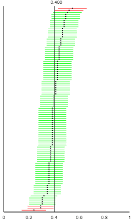 - The confidence intervals that are colored green succeed in capturing the value 0.4.