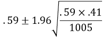 This calculation becomes .59 ± .03, which is the interval (.56, .62)*. Interpret what this confidence interval means. Most students are comfortable with concluding that we are 95% confident that something is between .56 and .62. The tricky part is articulating what that something is. Some students mistakenly say that we’re 95% confident that this interval includes the sample proportion who believe that the global poverty rate has doubled. This is wrong, in part because we know that the sample proportion is the exact midpoint of this interval. Other students mistakenly say that if researchers were to select a new sample of 1005 adult Americans, then we’re 95% confident that between 56% and 62% of those people would answer “doubled” to this question. This is incorrect because it is again trying to interpret the confidence interval in terms of a sample proportion. The correct interpretation needs to make clear what the population and parameter are: We can be 95% confident that between 56% and 62% of all adult Americans would answer “doubled” to the question about how the global rate of extreme poverty has changed over the past twenty years.